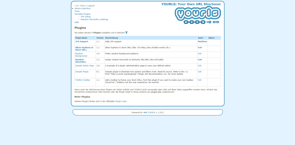 Gehe in das Admin-Panel deiner YOURLS-Installation und klicke auf den Menüpunkt “Manage Plugins” (Plugins verwalten).